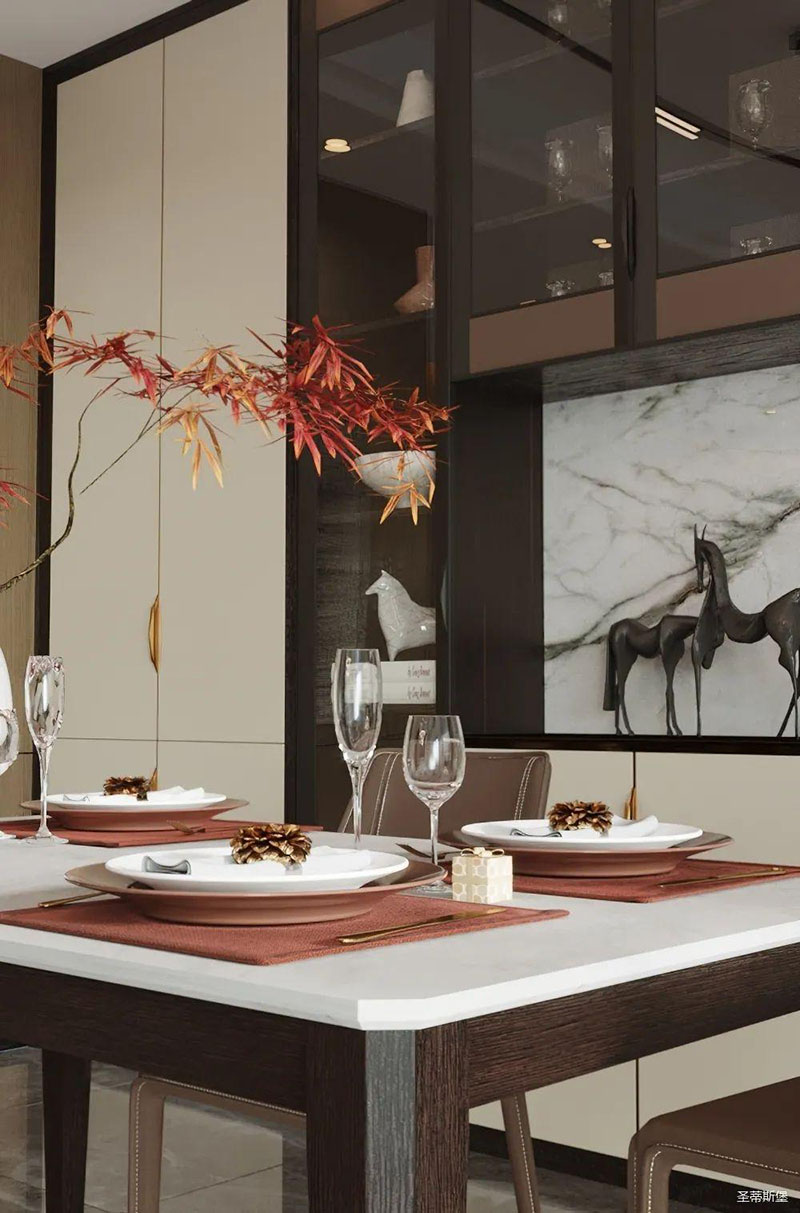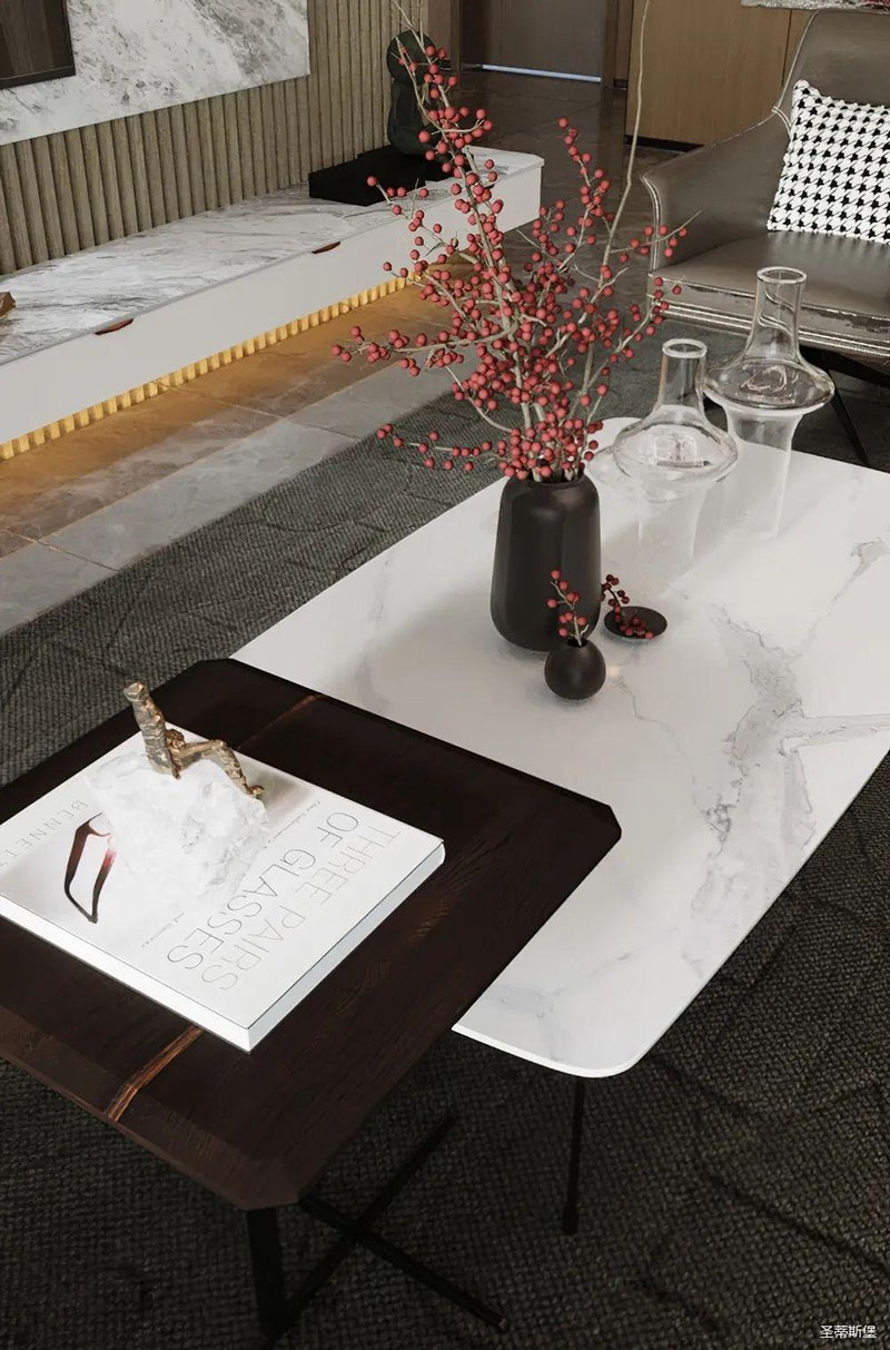 纯美的线条,沉稳的色泽,为空间定下了低调而华丽的基调。浑然天成的实木与岩板纹理,让角几荡漾出一幅“水光潋滟”的泼墨油画。三两红枝点缀,表达着“枝头并蒂祝吉祥”的美好祝愿。光影透过极简金属几脚,折射出一种隐藏的优雅气质。大小、高低不一的天然材质角几组合在一起,时尚又个性,不仅便于移动,还表现的灵活且轻巧。