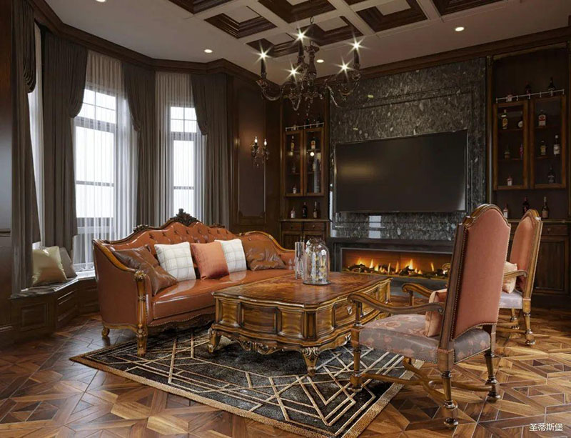 书房护墙板是由白枫木皮拼接的花鬘图案,颜色层次分明,立体感超强,营造了满满的美式镶嵌艺术感。深沉木色边柜在护墙板上延伸,逐渐浸染了古铜色的家具和灯饰,结合着拱形罗马柱,塑造出端雅大方的环境氛围。