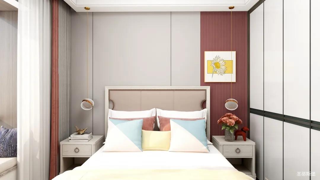 儿童空间虽不及其他空间宽敞,但细节设计更为贴心,淡粉的床屏与酒红木饰面形成深浅色的对比,色彩跳跃,洋溢着儿童应有的青春活力。床前的阅读灯,让空间设计感up的同时,也便利了儿童的阅读学习。