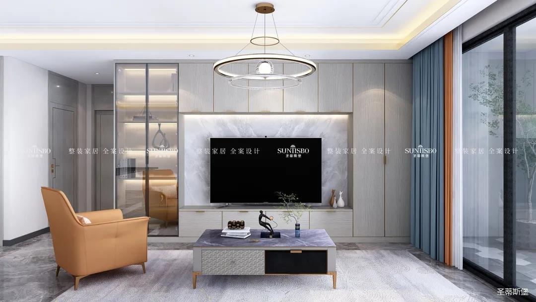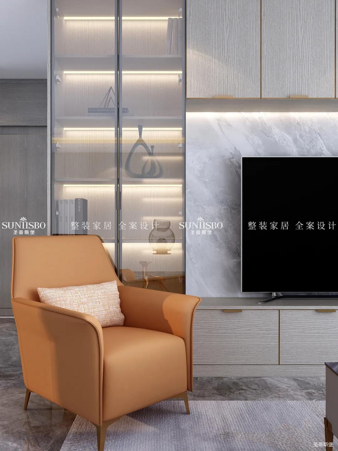 高级灰+活力橙,是百看不厌的经典搭配,当冷静与热情碰撞,为客厅奠定了时尚优雅的基调。设计师以定制柜为原型,打造出兼具实用与装饰功能为一体的电视背景墙,金属包边的柜体,在几何灯光的照耀下散发出光泽,提升了整体空间的质感,也撩动着我们的心弦。
