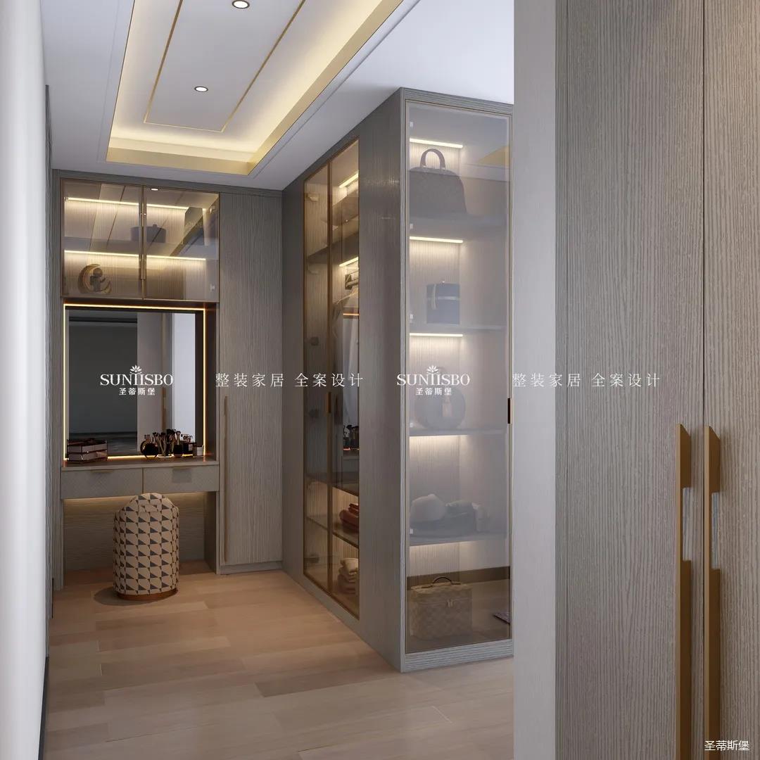 半开放式衣帽间分隔了主卧与梳妆两个独立空间,金色是诠释华贵最直接的表达,将金属镶嵌于玻璃材质与实木之间,令空间光芒透射加倍。