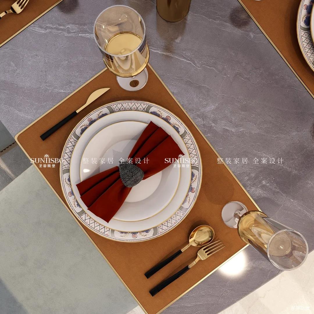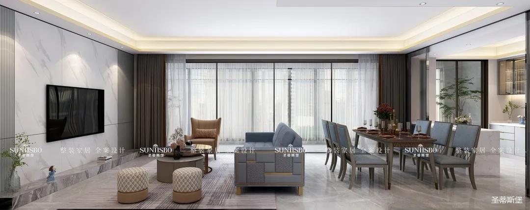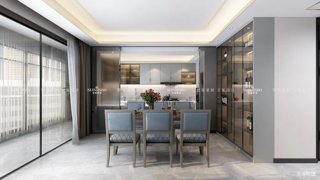 设计师通过对居者在空间中互动关系的细致设想,遵循经典的简奢风格设计,细腻考究人居与空间关系,反复推敲布局,将客餐厅横列排布,增加居者的交流互动。