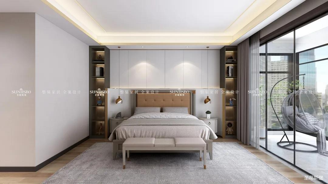 床屏上的金属元素与软装饰品相互呼应,尽显精致优雅的美学内核,对称式的定制柜体,循着实用的痕迹,展现了空间的对称美感。