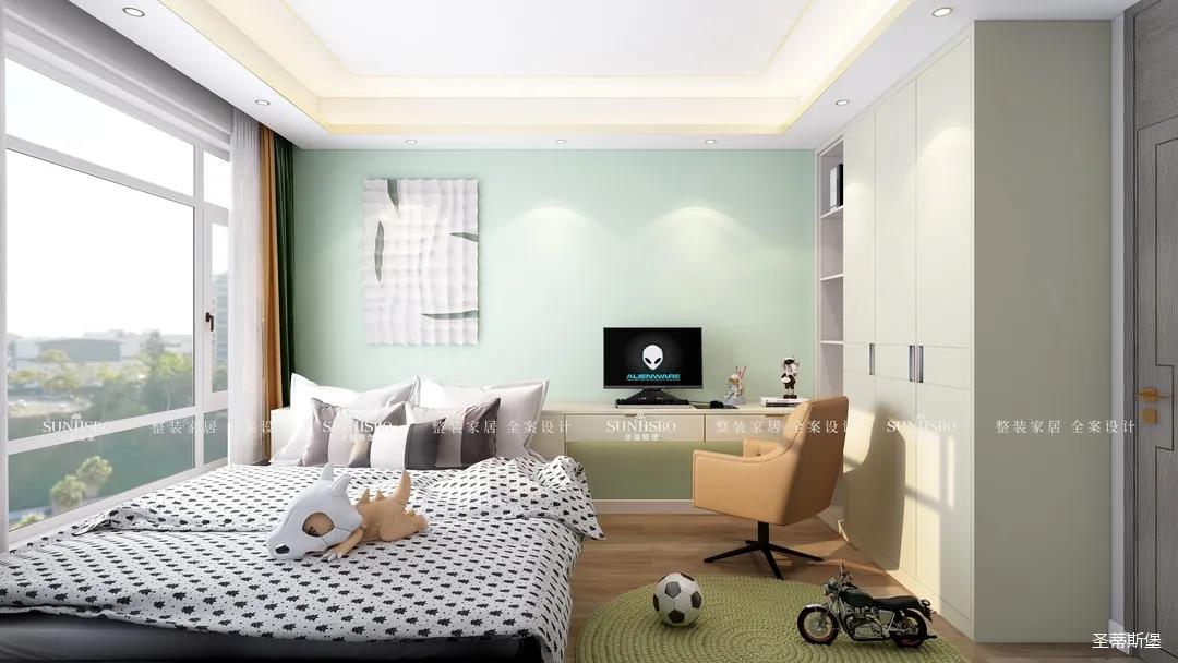 儿童房是清新的浅绿格调,时尚个性又不失温馨舒适。衣柜与墙体深浅色完美匹配整体硬装,协调统一。黑白圆点棉质床品与壁画形成同色系搭配,充盈了空间的饱满度。