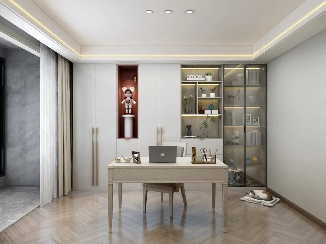 书柜以虚实结合的体块感呈现,疏密不一,相异的色调在横纵间碰撞交错,演绎灵动随性之美,踱入书房,这一隅是阅读、办公最好的场所。