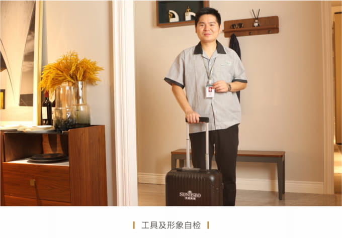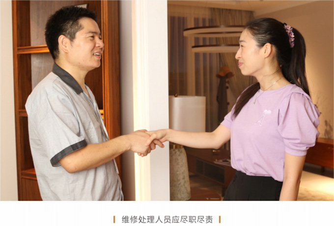 产品处理完毕后必须一站式通检,指导客户使用,并将服务过程中产生的垃圾随手带走,家具维修完毕后,应用毛巾将家具擦拭一遍,确保产品清洁。